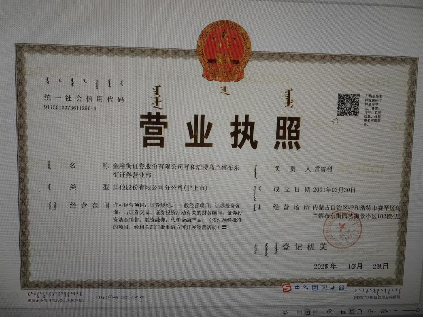 | 金融街证券股份有限公司呼和浩特乌兰察布东街证券营业部 | ||