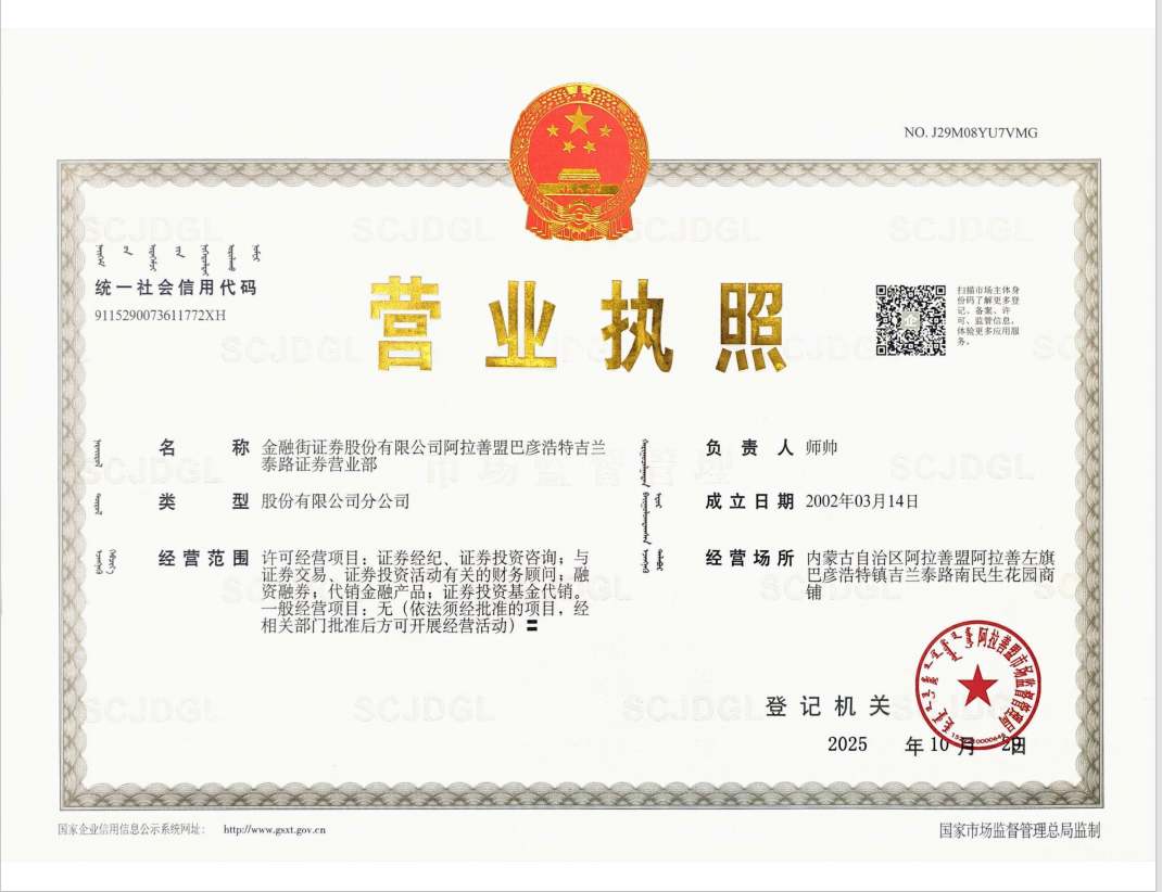 | 金融街证券股份有限公司阿拉善盟巴彦浩特吉兰泰路证券营业部 |