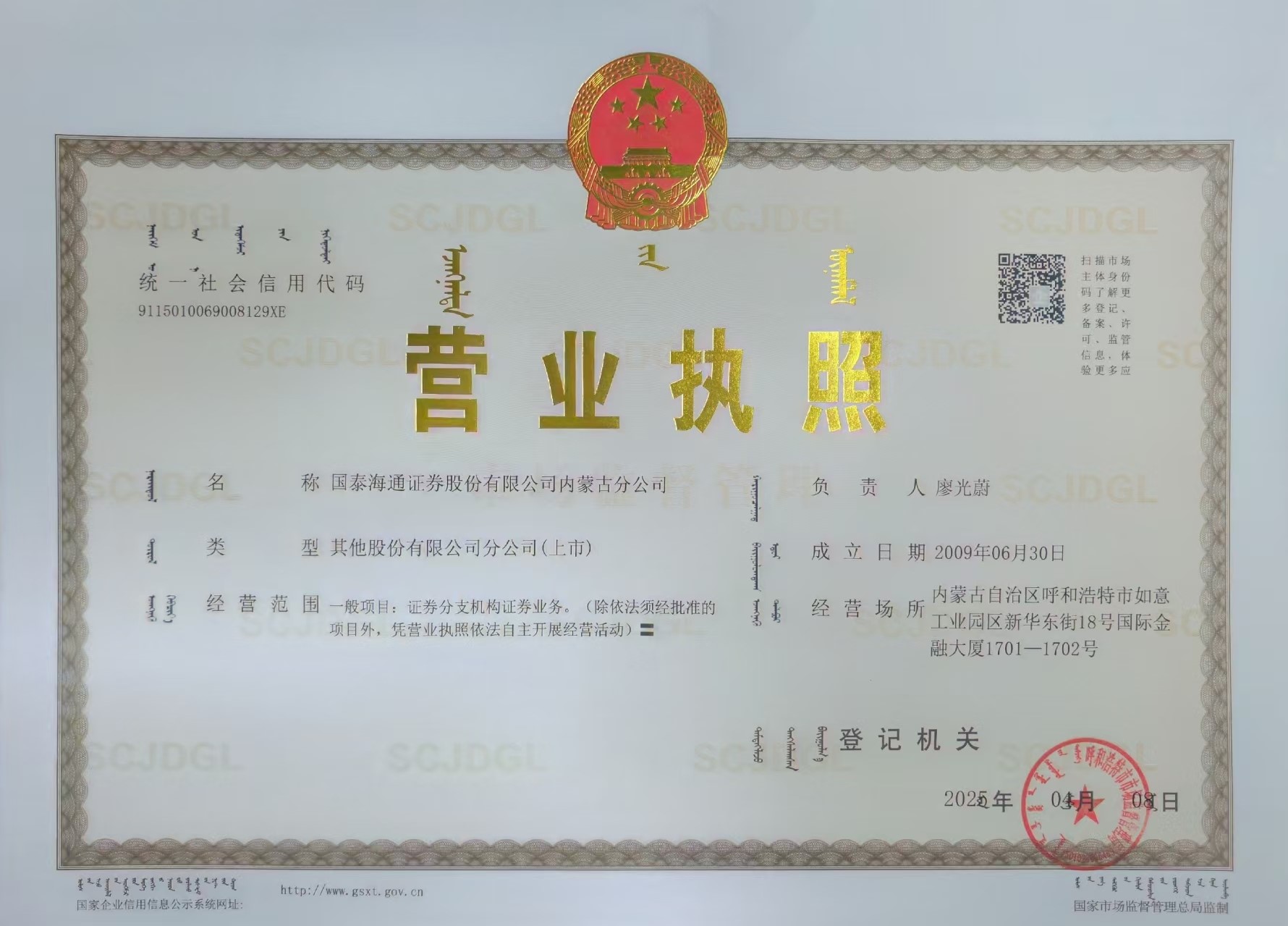 国泰海通证券股份有限公司内蒙古分公司下辖呼和浩特、赤峰、包头、鄂尔多斯、巴彦淖尔六家营业网点,业务范围覆盖内蒙古全区辐射全国,业务品种涵盖A股、B股、期货、期权、代办股份、基金、债券、股票承销、债券发行、资产委托管理、理财顾问及融资融券等业务。分公司秉承“诚信、责任、亲和、专业、创新”的核心价值观和“以客户为中心、以市场为导向,与客户共成长”的发展方针,构建君弘财富俱乐部会员服务及增值服务等多项全方位个性化的投资理财服务体系,为投资者的证券投资保驾护航,伴随中国资本市场共同成长。