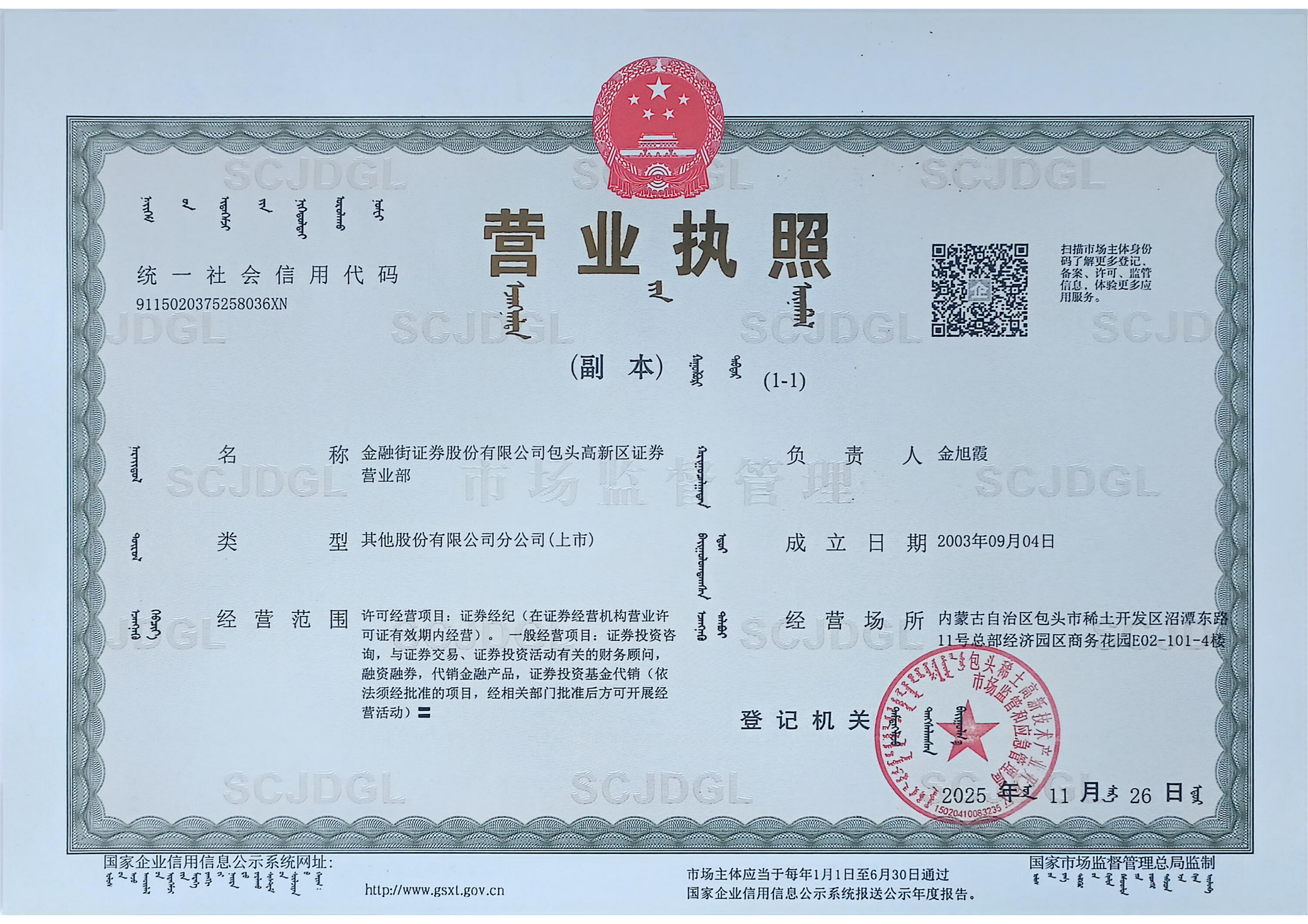 | 金融街证券股份有限公司包头高新区证券营业部 | ||